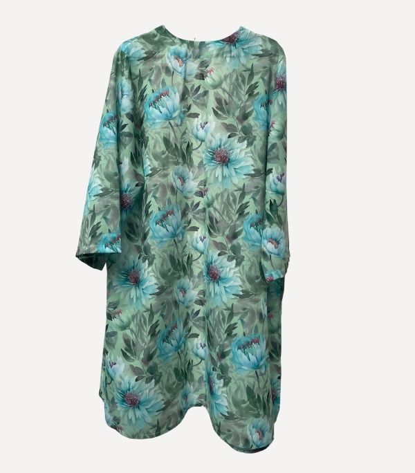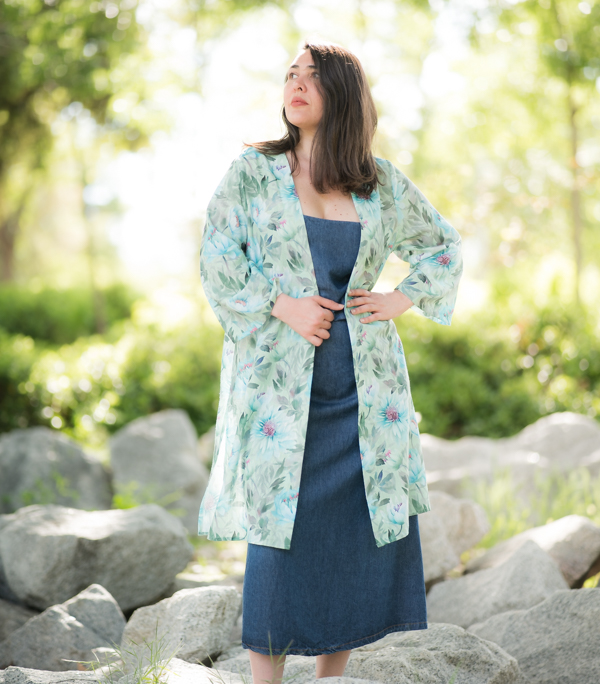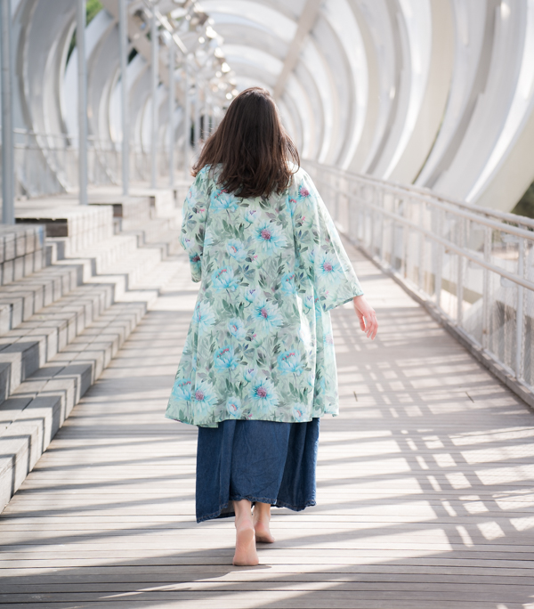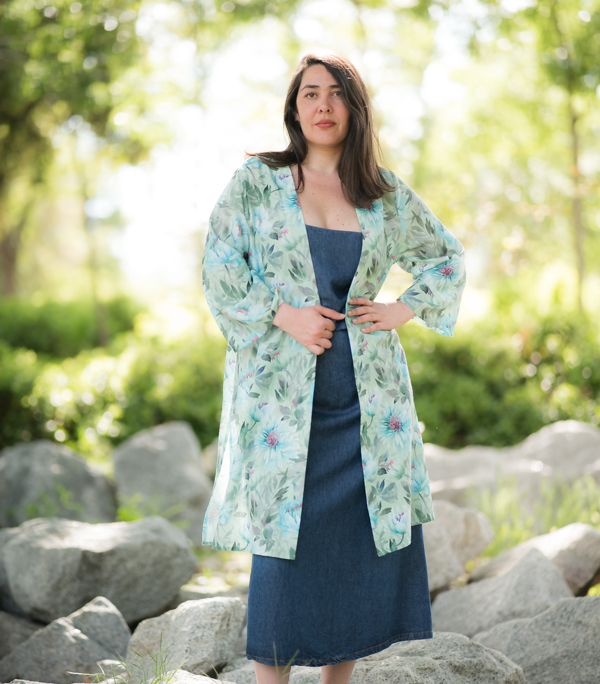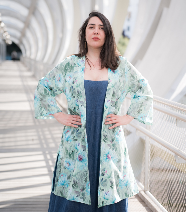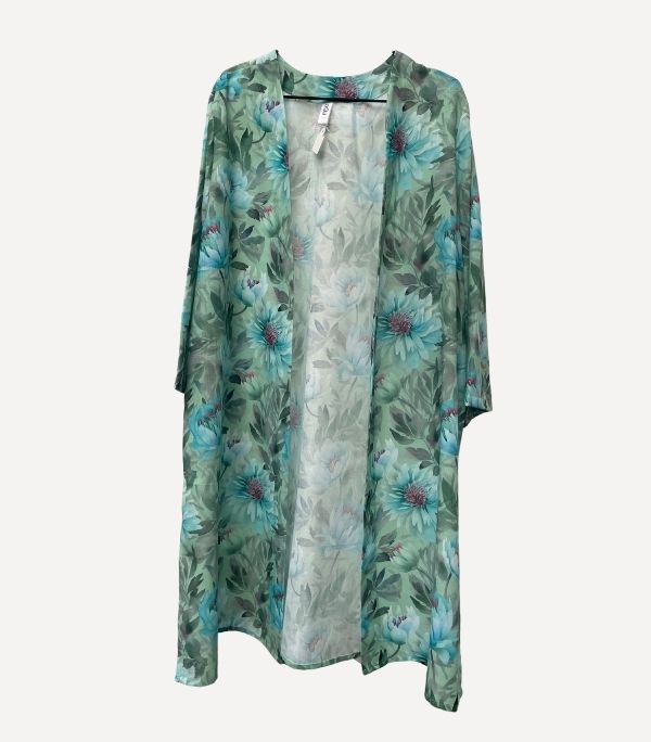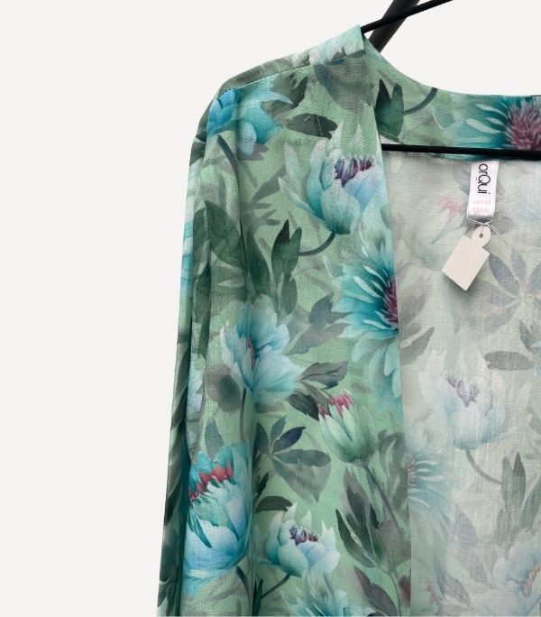 Este kimono ligero con estampado floral en tonos verde agua, azul y violeta evoca la frescura de un jardín al amanecer. Su diseño fluido, sin cierres, cae con naturalidad aportando movimiento y elegancia a cualquier look. Con mangas amplias de largo tres cuartos y aberturas laterales, es perfecto para llevar sobre vestidos, vaqueros o como pieza protagonista en un look de verano. Un kimono versátil, artístico y lleno de vida que eleva al instante tu estilo diario.
