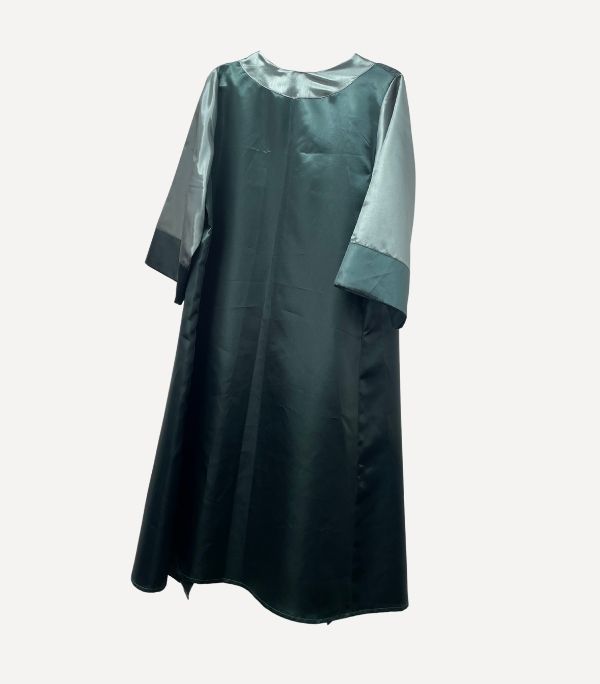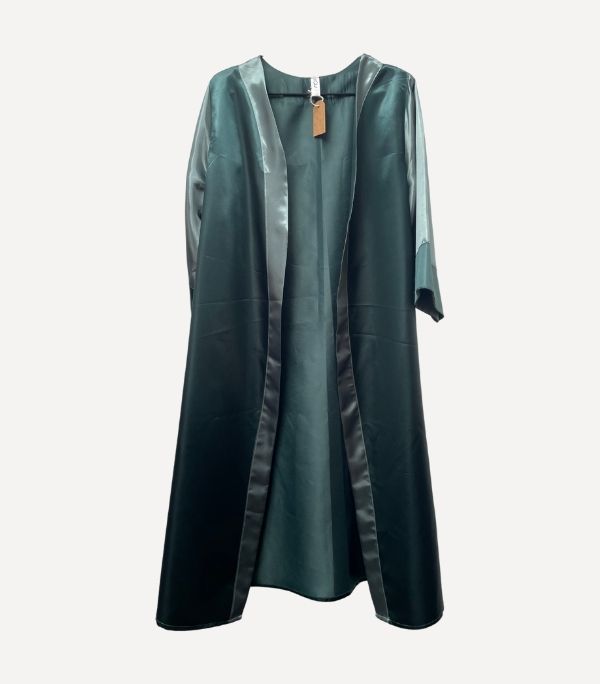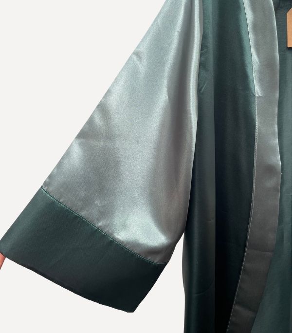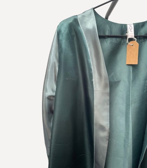 Kimono largo elegante y una combinación de tonos verdes menta. Esta pieza destaca por su presencia sofisticada. De manga recta, es ideal como prenda protagonista en estilismos formales o para elevar un look sencillo con un toque artístico y vibrante. Una pieza que destaca con luz propia