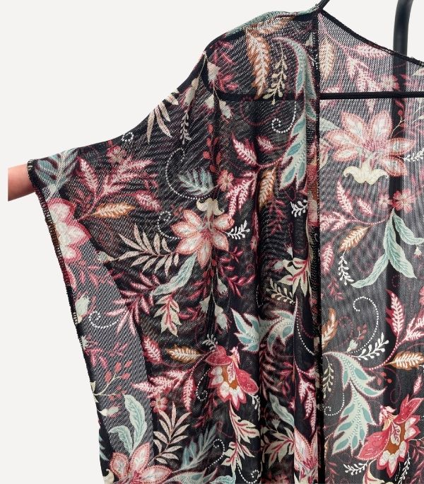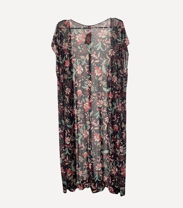 Este kimono largo está confeccionado en una tela mesh ideal para acompañar vestido de baño o looks muy ligeros de verano, añade un toque diferente a tus outfits de veranito con este modelo estampado con un fondo negro