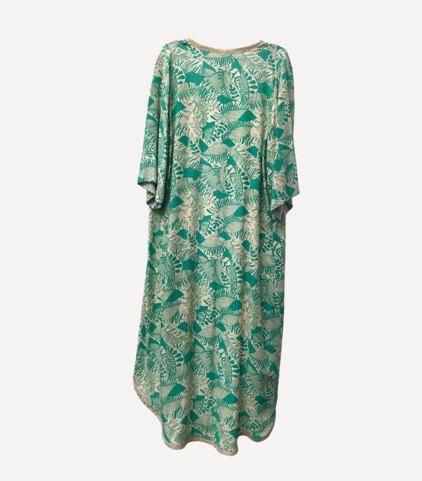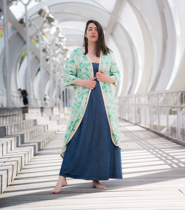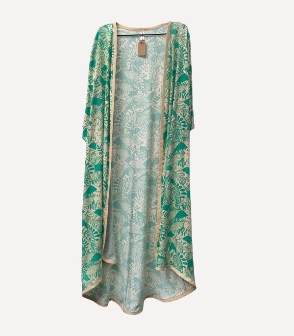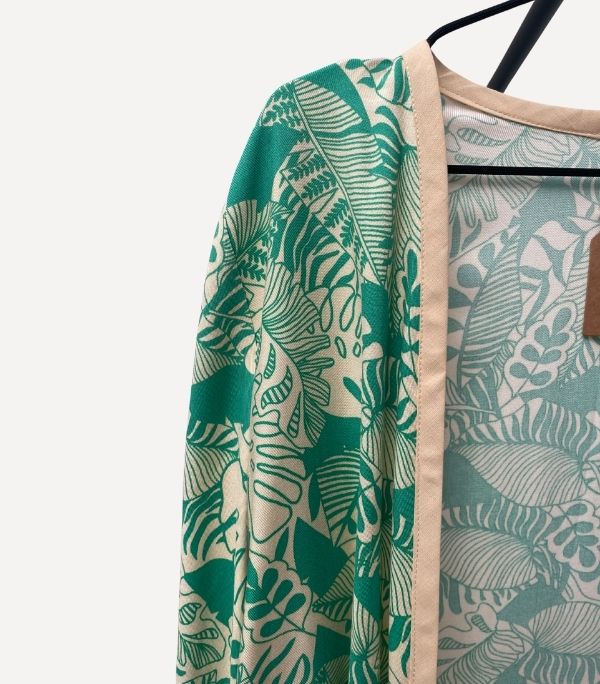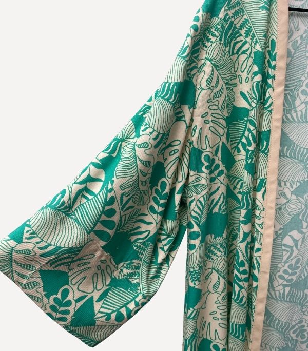 El kimono Turquesa Garden es una pieza que transmite calma, frescura y sofisticación. Su estampado floral en tonos turquesa, arena y blanco sobre base beige crea una armonía natural perfecta para días de sol o noches especiales. Confeccionado en tejido fluido y con un largo generoso, su movimiento al caminar es tan delicado como su diseño.